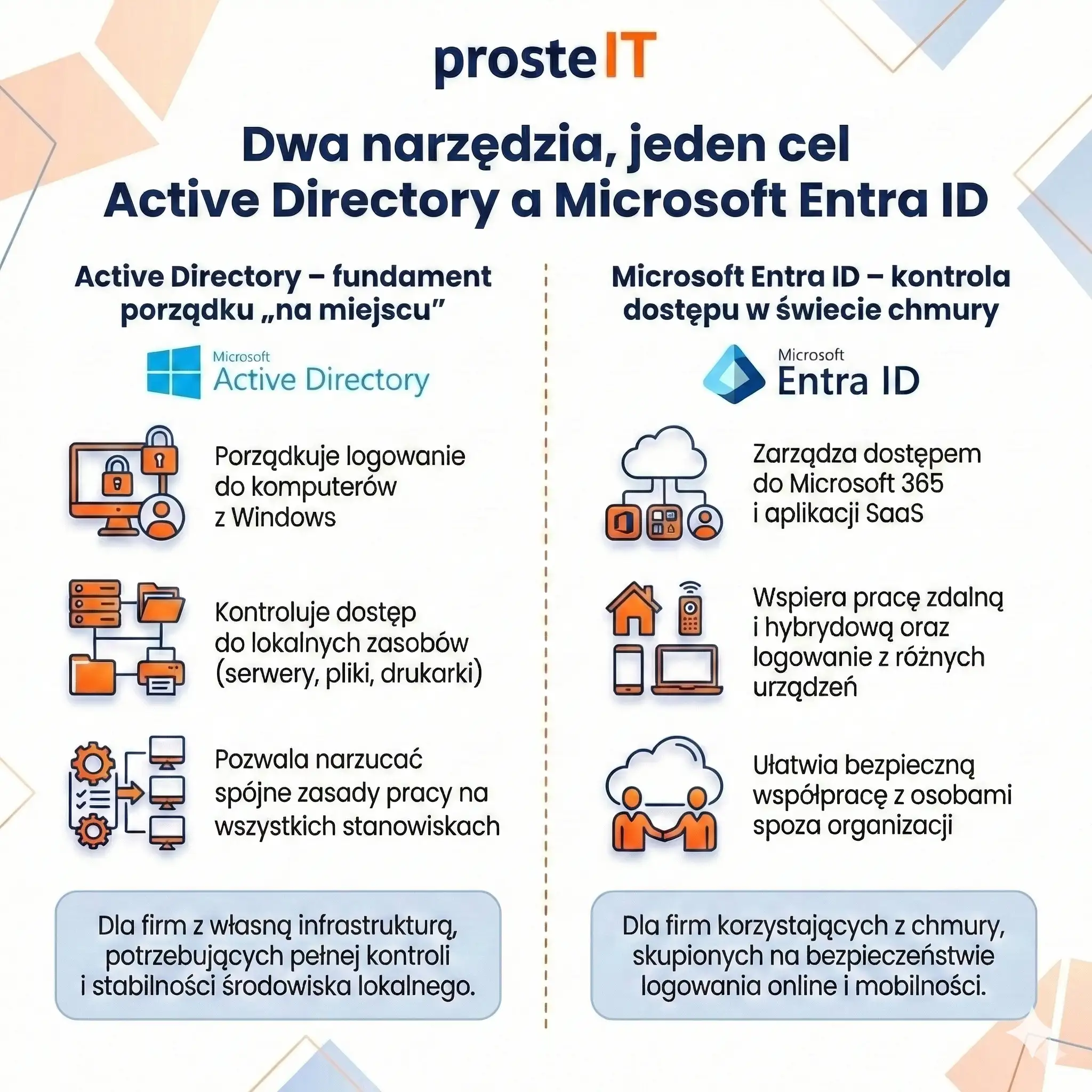 Właśnie w tym miejscu pojawiają się pojęcia takie jak Active Directory i Microsoft Entra ID. Dla jednych brzmi to jak coś bardzo technicznego, „dla dużych korporacji”. Dla innych to po prostu kolejne nazwy z ekosystemu Microsoft, które trudno odróżnić. A prawda jest dużo prostsza – to narzędzia do porządkowania tożsamości, logowania i dostępu w firmie.