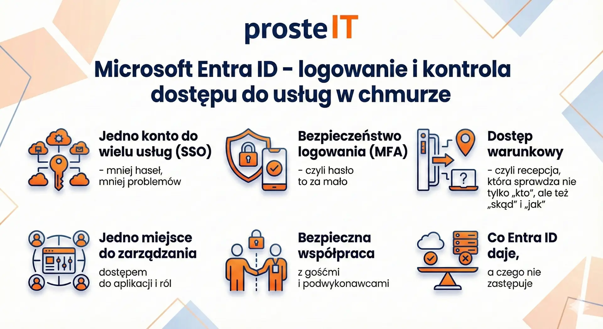 Warto od razu rozjaśnić nazwę. Microsoft Entra ID to nowe nazewnictwo rozwiązania znanego wcześniej jako Azure Active Directory (Azure AD). Funkcjonalnie mówimy o tym samym „centrum logowania” dla usług Microsoft i tysięcy aplikacji innych dostawców. Dla firmy najważniejsze jest nie to, jak to się nazywa, tylko co rozwiązuje: problem chaosu w kontach i dostępach, gdy praca przenosi się do internetu.