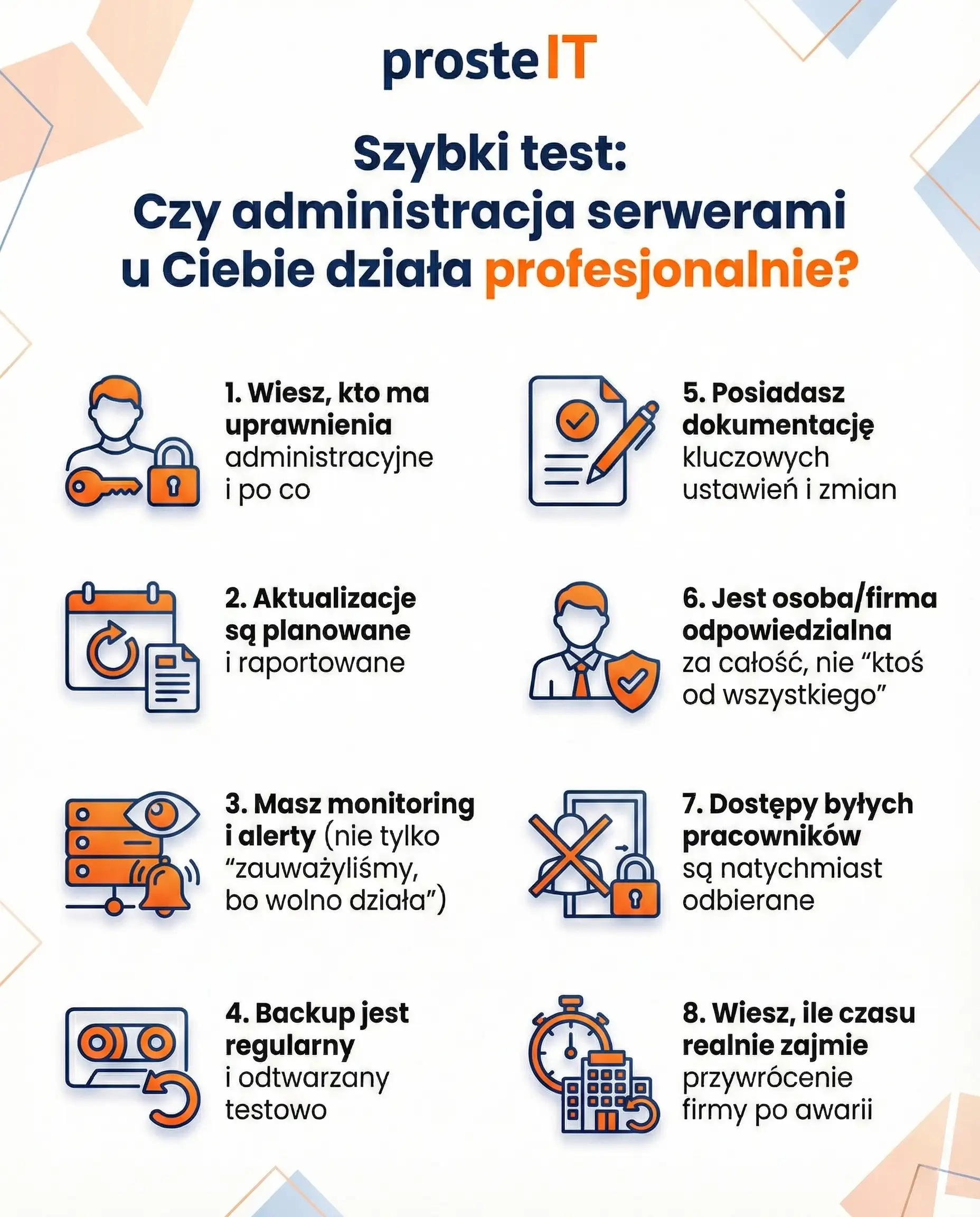 W wielu firmach tak właśnie jest postrzegana. Serwer działa, więc temat znika z listy priorytetów. Dopóki nie pojawi się problem, administracja sprowadza się do „kogoś, kto w razie czego zerknie”. I to jest moment, w którym zaczynają się schody.