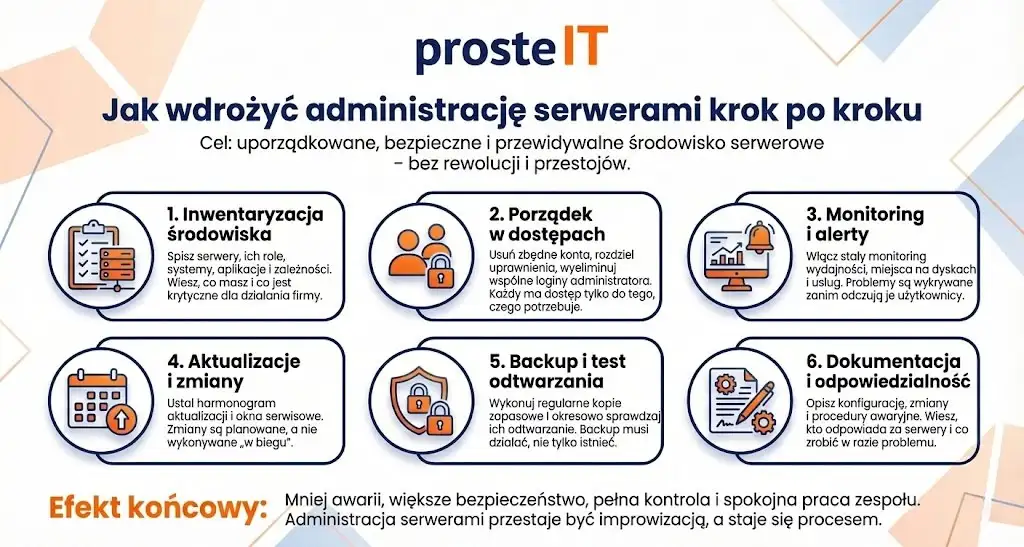 Dobra administracja serwerami to zmiana perspektywy: z reaktywnej na zaplanowaną. Z „jak coś padnie” na „wiemy, co mamy, kto za to odpowiada i co może pójść nie tak”. Dla małych i średnich firm to często jeden z najprostszych sposobów, żeby ograniczyć ryzyko, uporządkować IT i odzyskać poczucie kontroli nad technologią, która realnie napędza biznes.