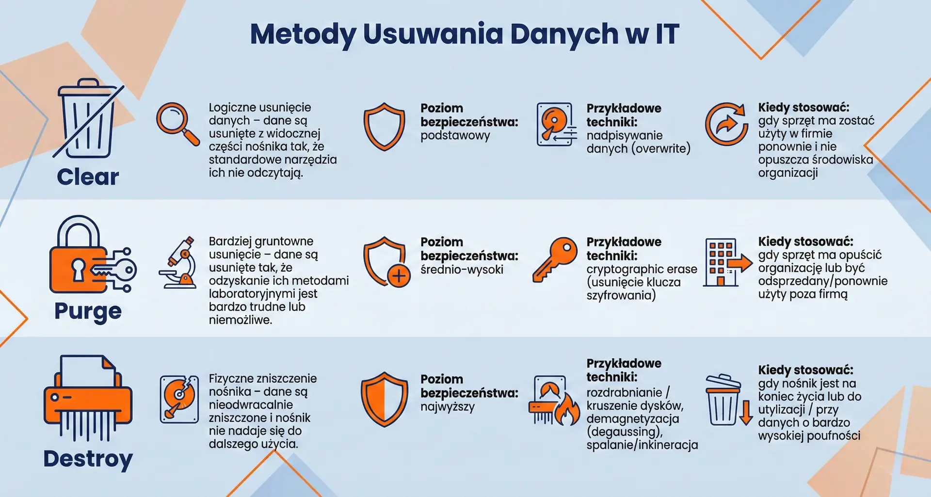 • Purge – najlepszy wybór, gdy sprzęt ma opuścić firmę, ale istnieje potrzeba ponownego użycia lub odsprzedaży, a dane są poufne.