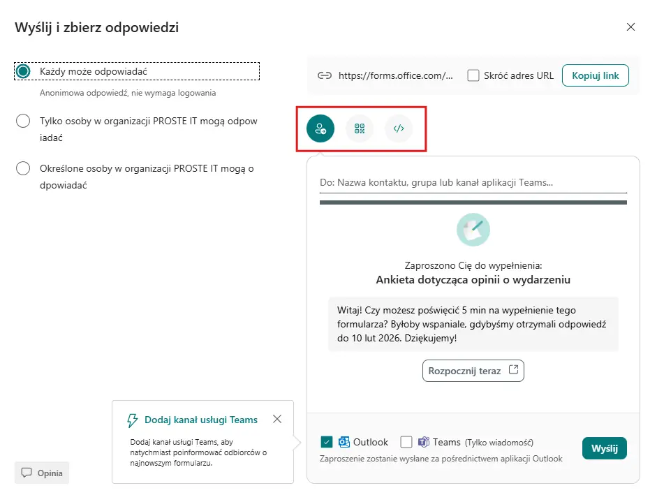 Jedną z największych zalet Microsoft Forms jest prosty sposób udostępniania formularzy. Bez dodatkowych konfiguracji możesz dopasować formę publikacji do tego, kto i w jakim kontekście ma z niego skorzystać.