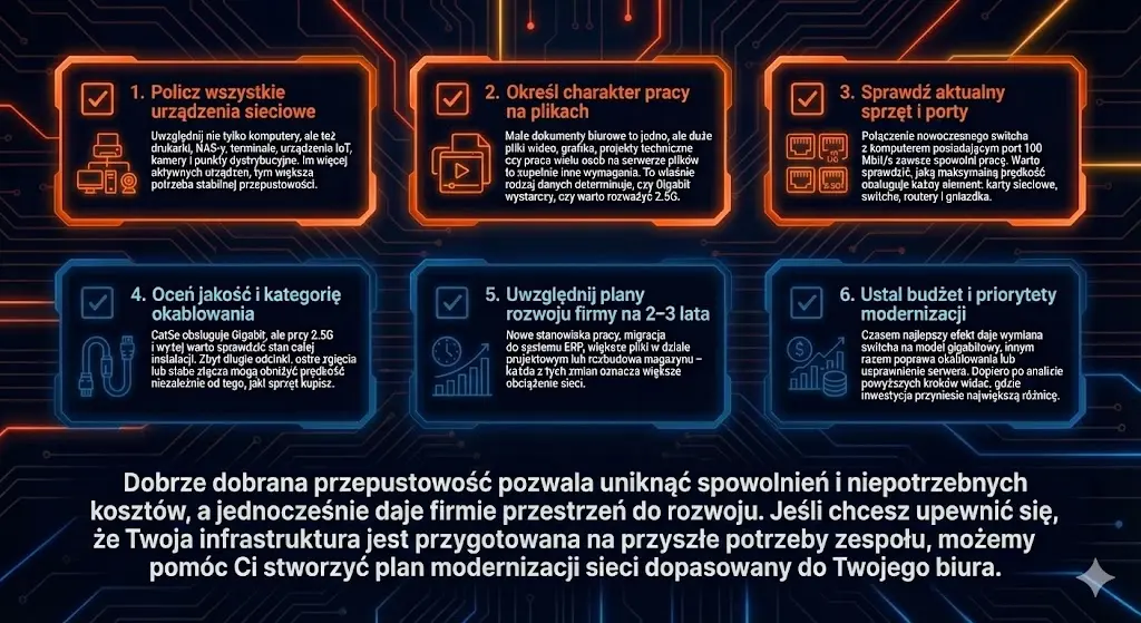 Dlaczego to takie ważne? Bo wszelkie wąskie gardła pojawiają się tam, gdzie najsłabszy element ogranicza całą linię. Nawet jeśli większość urządzeń obsługuje 1 Gbit/s, jeden stary odcinek 10/100 Mbit/s potrafi zwolnić pracę całego biura w najbardziej newralgicznym momencie. Dlatego planując przepustowość, patrzymy nie tylko na liczby z katalogu, ale przede wszystkim na spójność całej infrastruktury, która ma działać stabilnie w codziennych warunkach firmowych.